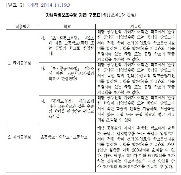 국내 공무원의 자녀 학비보 조수당은 수업료와 학교 운영비가 지급됩니다.