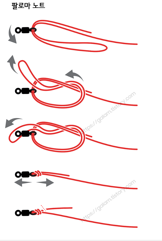 팔로마 매듭법은 클런치와 유니 매듭보다 강한 결속력을 제공하는 매듭법입니다. 이 매듭법은 라인을 두 가닥으로 접은 후 도래 고리에 통과시키고, 루프를 만들어 조여주는 방식으로 진행됩니다. 팔로마 매듭은 약간의 요령이 필요하지만, 연습을 통해 깔끔하고 강한 매듭을 만들 수 있습니다.
