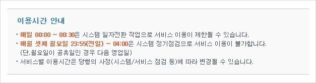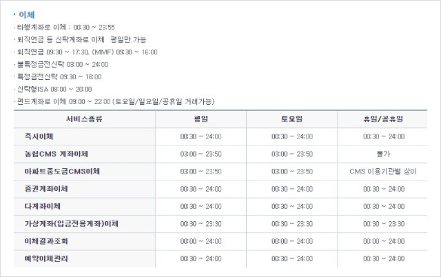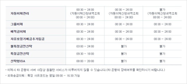 - 통합 즉시 이체: 00:30분부터 23:50분까지 (이용시간 제한)