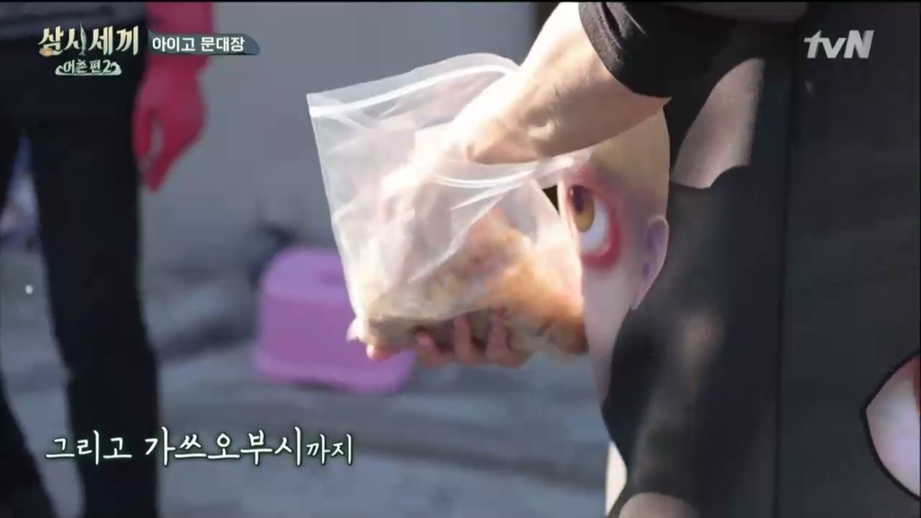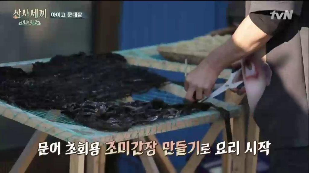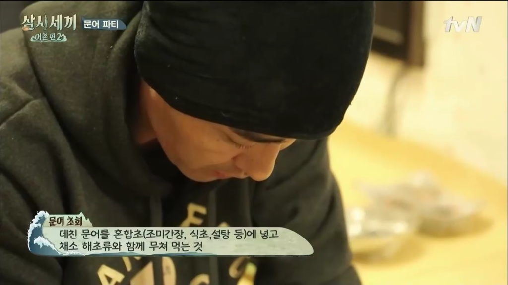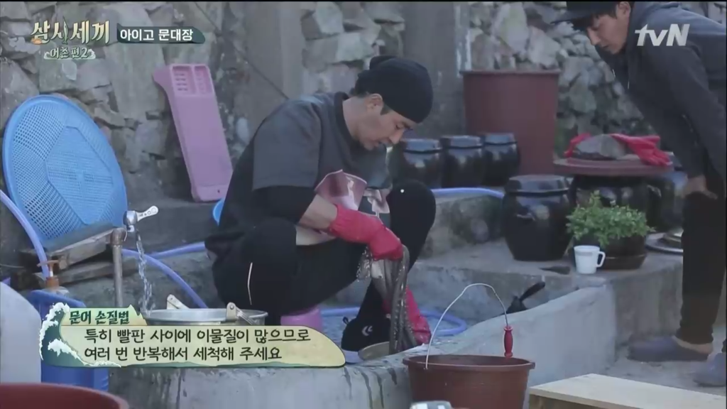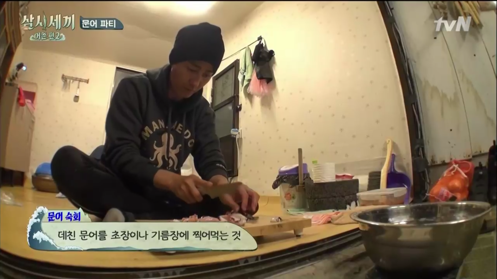 삼시세끼 어촌편 시즌2에서 처음 문어를 잡았을 때 겨우겨우 잡은 커다란 만재도 참문어(돌문어, 피문어)는 산락 직후에 잡혔는지 살짝 힘이 없긴 해도 먹어도 된다는 기쁜 소식에 차줌마가 요리를 시작합니다.