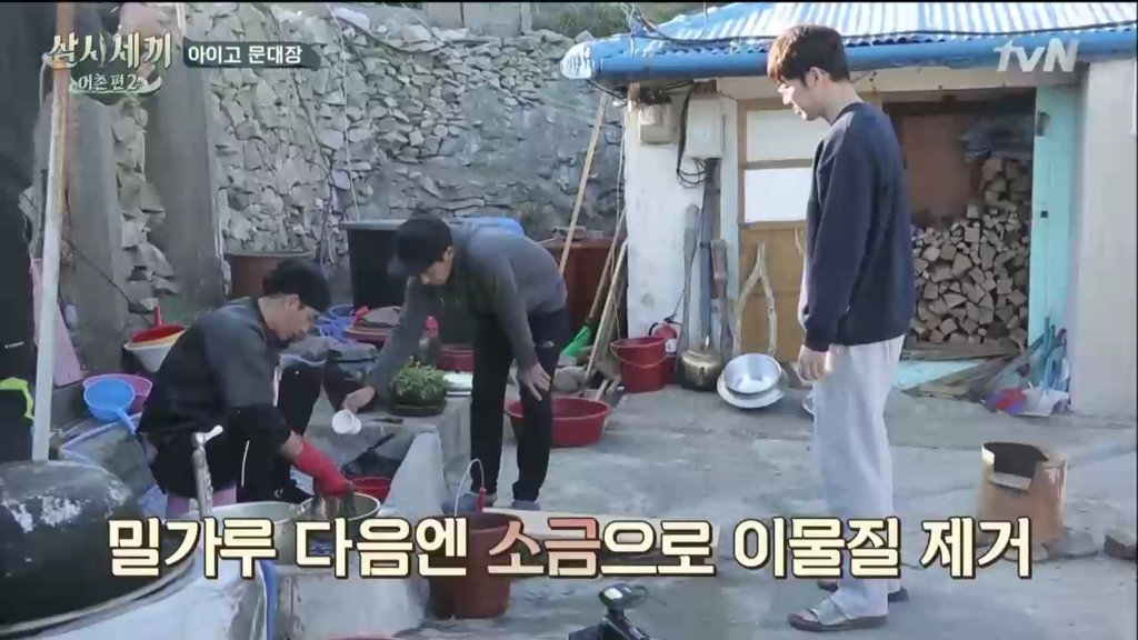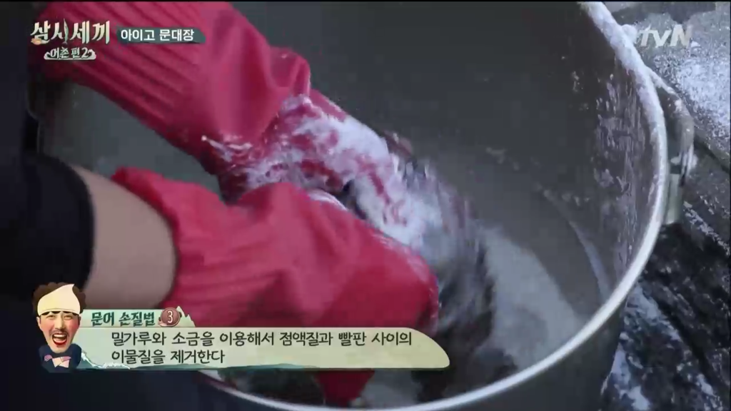 밀가루로 한 번 한 뒤에 소금으로 이물질을 더 제거.