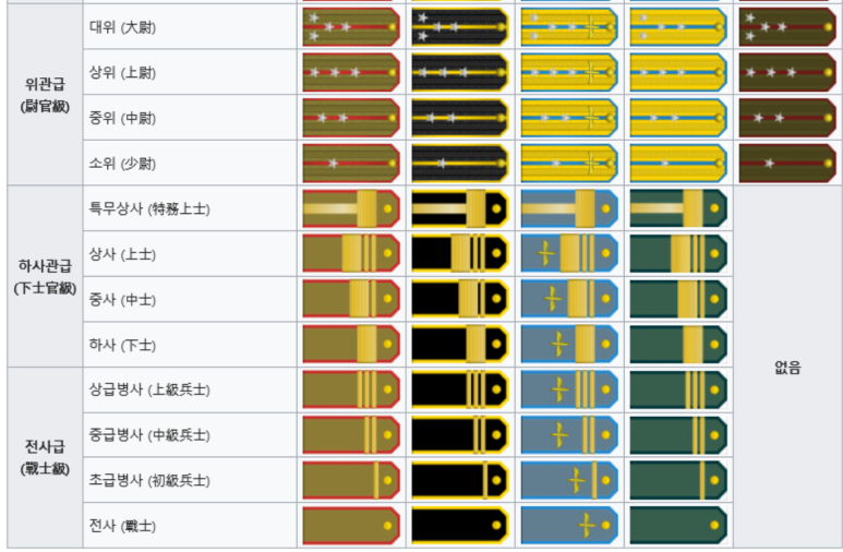 또한, 하전사의 경우 특무상사, 상사, 중사, 하사로 구분되는 사관과 상등병, 전사로 구분되는 일반병으로 이루어져 있습니다. 일반병의 경우 1998년 4월에 계급체계가 세분화되어 상급병사, 중급병사, 초급병사, 전사로 세분화되었습니다.