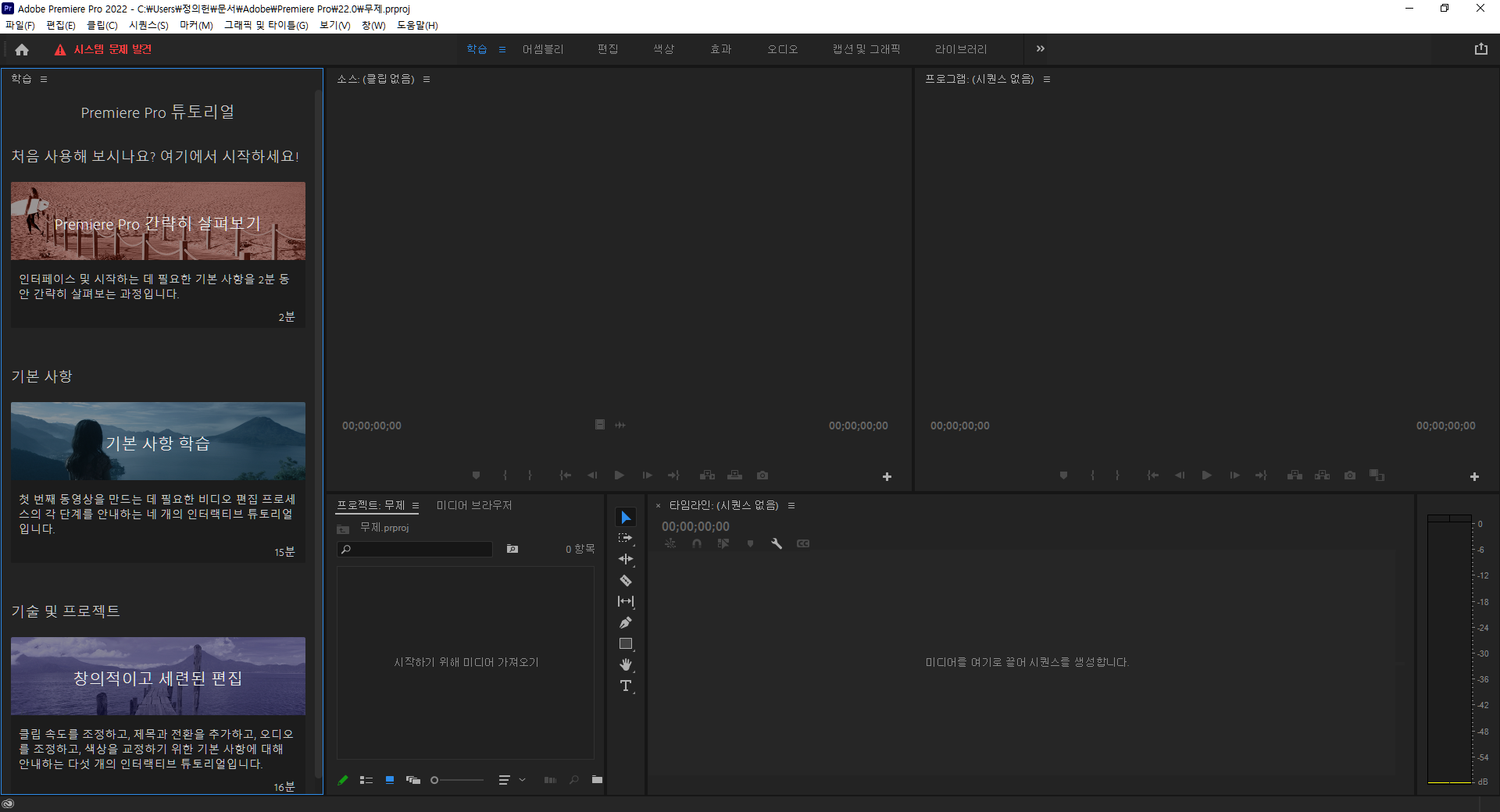 - 화면에 어도비 프리미어 프로 2023의 실행 화면이 나타납니다.