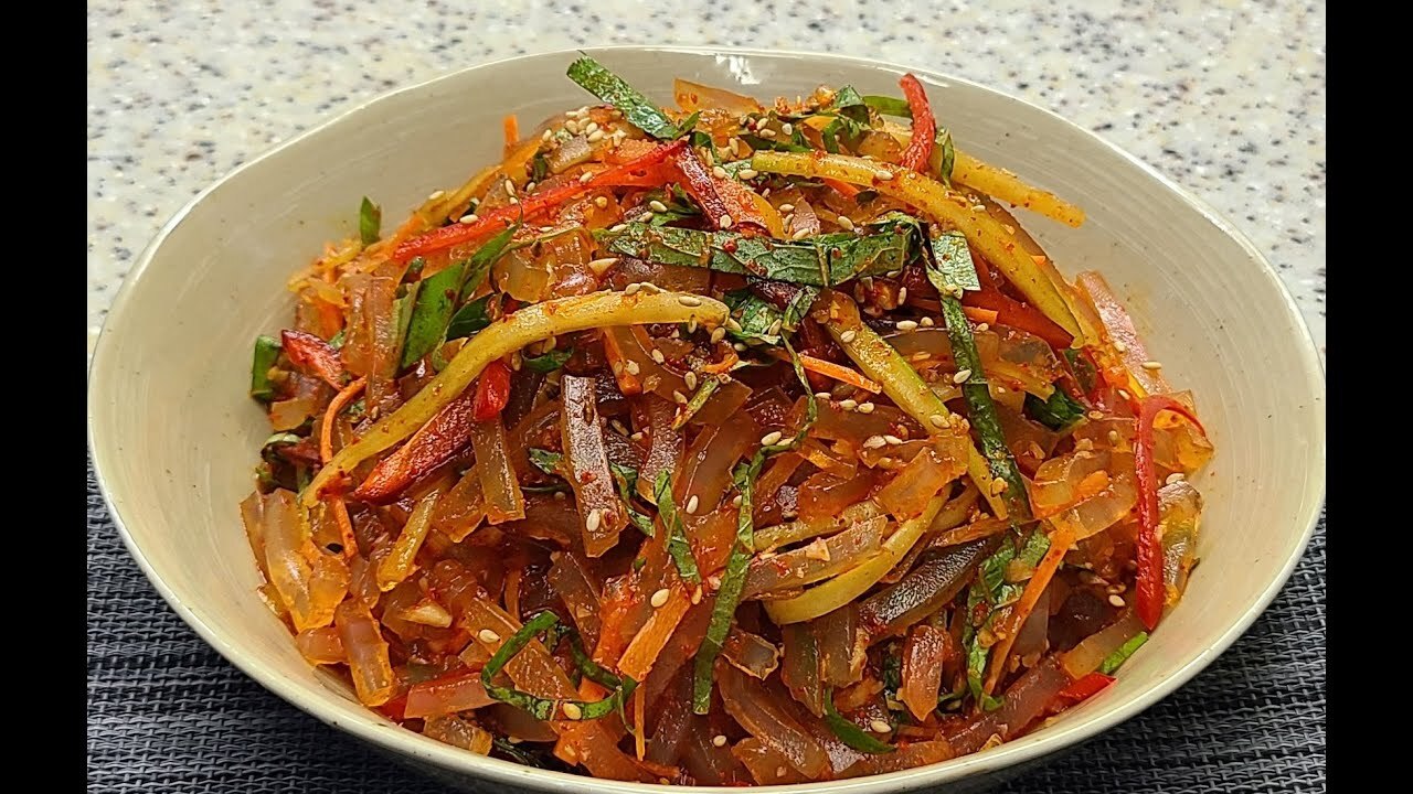 - 색감 가득한 완성: 알록달록한 채소와 함께 맛있는 우뭇가사리 무침이 완성되었습니다.