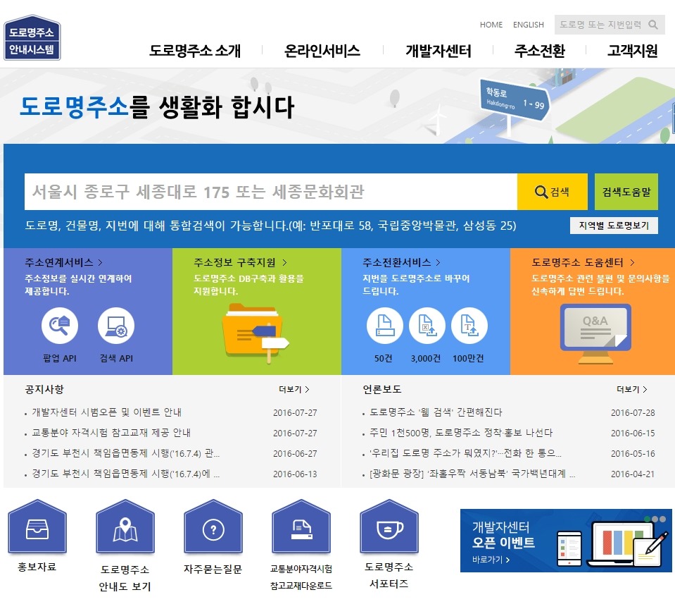 검색창에서 도로명주소로 검색하면, 도로명주소 안내시스템 사이트가 나옵니다.