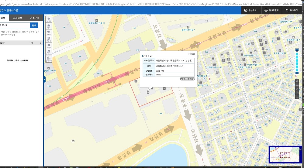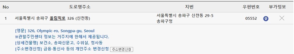 예시로 송파구청의 옛 주소인 신천동 29-5를 검색해 보았더니, 두 개의 결과가 나오는군요. 대구에도 신천동이 있었군요. 아무튼 송파구청은 신천동 29-5라는 옛날 주소에서 새 주소인 올림픽로 326으로 나오고 우편번호 5자리 05552도 나오는군요.