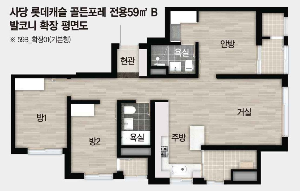 전용면적 59㎡ 아파트를 예로 들어 보면 다음과 같은 구조가 일반적입니다.
