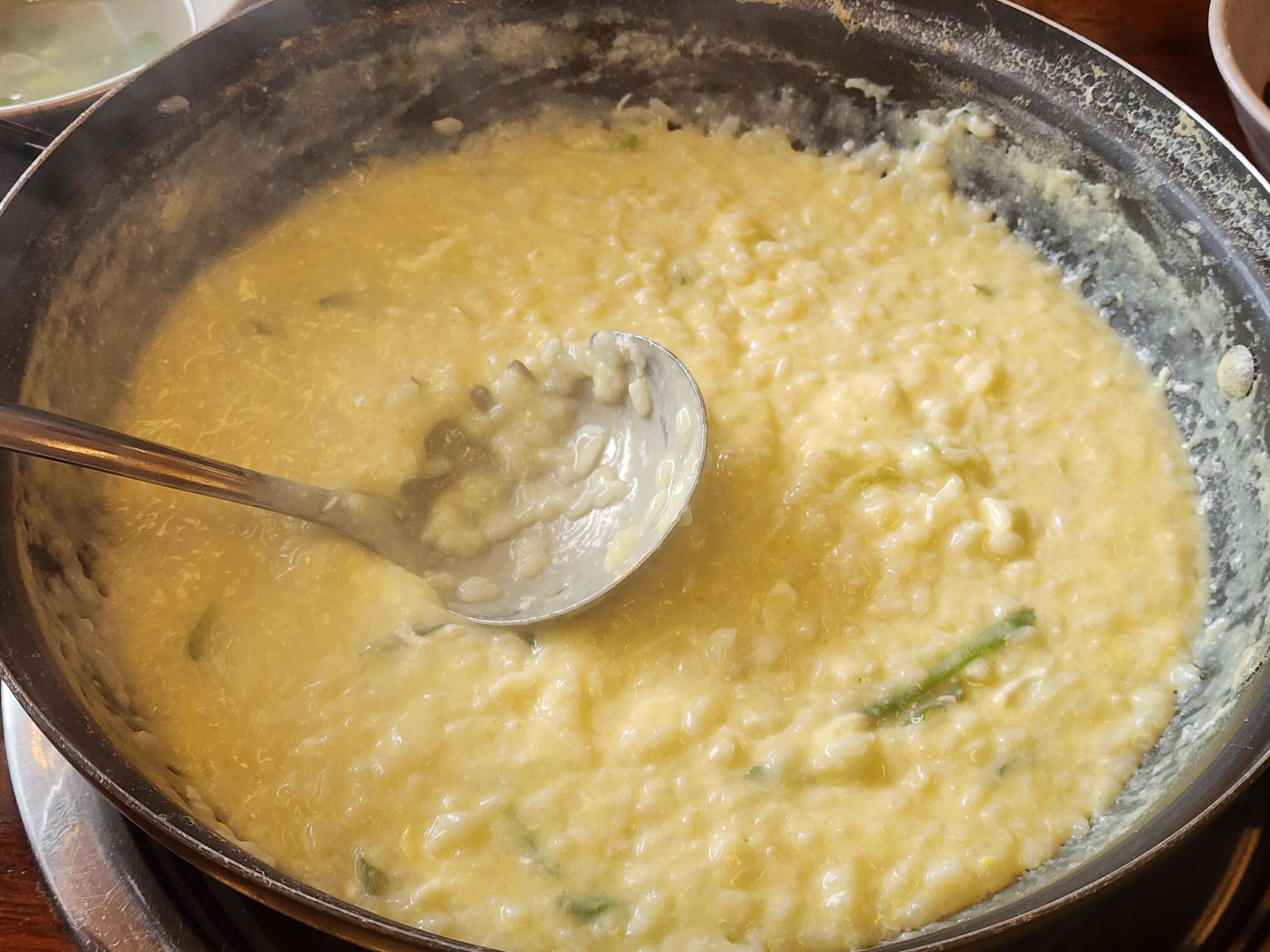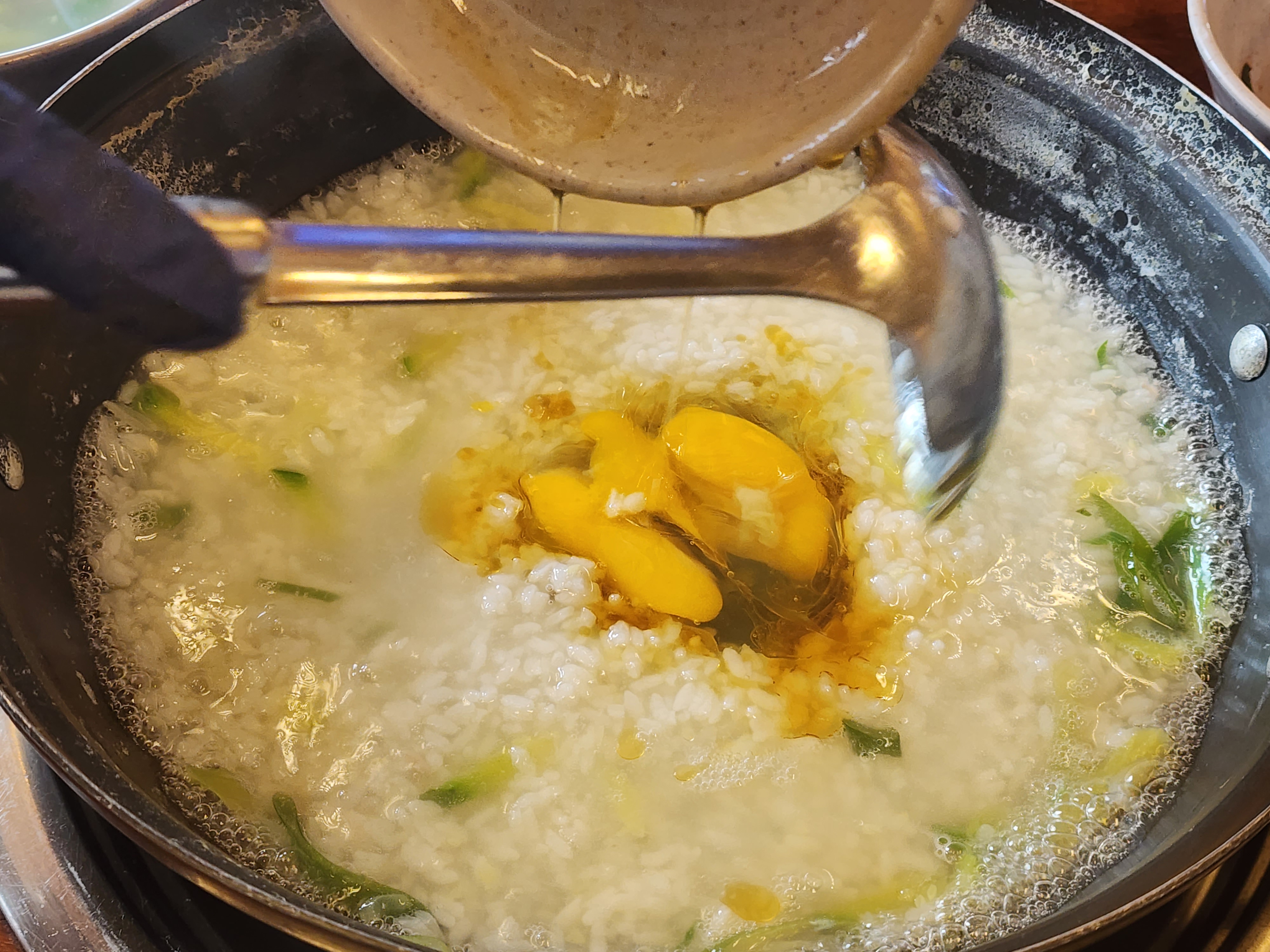 그리고 끝내는 것은 고소한 계란죽! 계란과 공깃밥, 참기름을 넣어 끓여 만든 담백하고 고소한 맛을 즐길 수 있습니다.