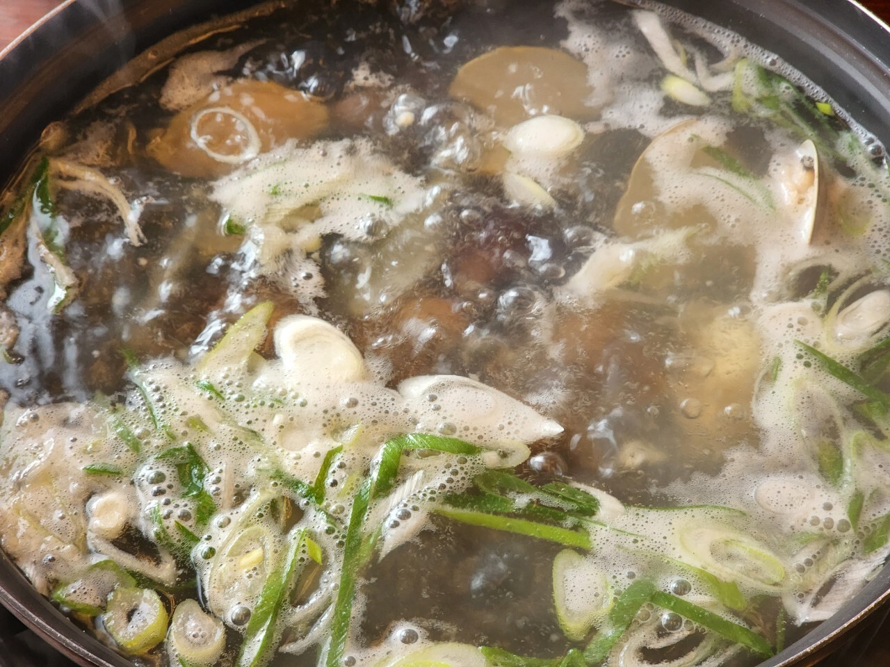 싱싱한 백합조개는 물론, 국물에 칼국수 면과 애호박을 함께 끓여 먹습니다. 이 애호박은 신선한 맛과 적당히 달달한 맛을 더해 주어 칼국수의 맛을 한층 업그레이드합니다.
