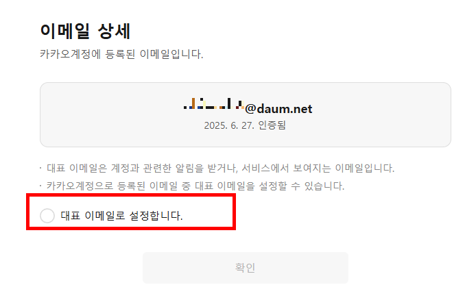 - 이렇게 하면 카카오 계정의 대표 이메일 주소가 변경되어 티스토리 서비스 이용 시 대표 이메일이 daum.net 주소로 인식됩니다.