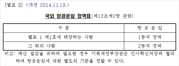 항공운임이나 선박 운임에서 1등석과 2등석 정액요금은 각각 1호에 해당하는 공무원과