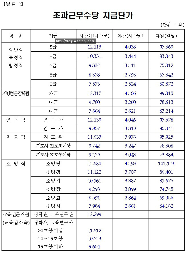 2020년 공무원 초과근무수당 단가표 교사 포함 군인 제외