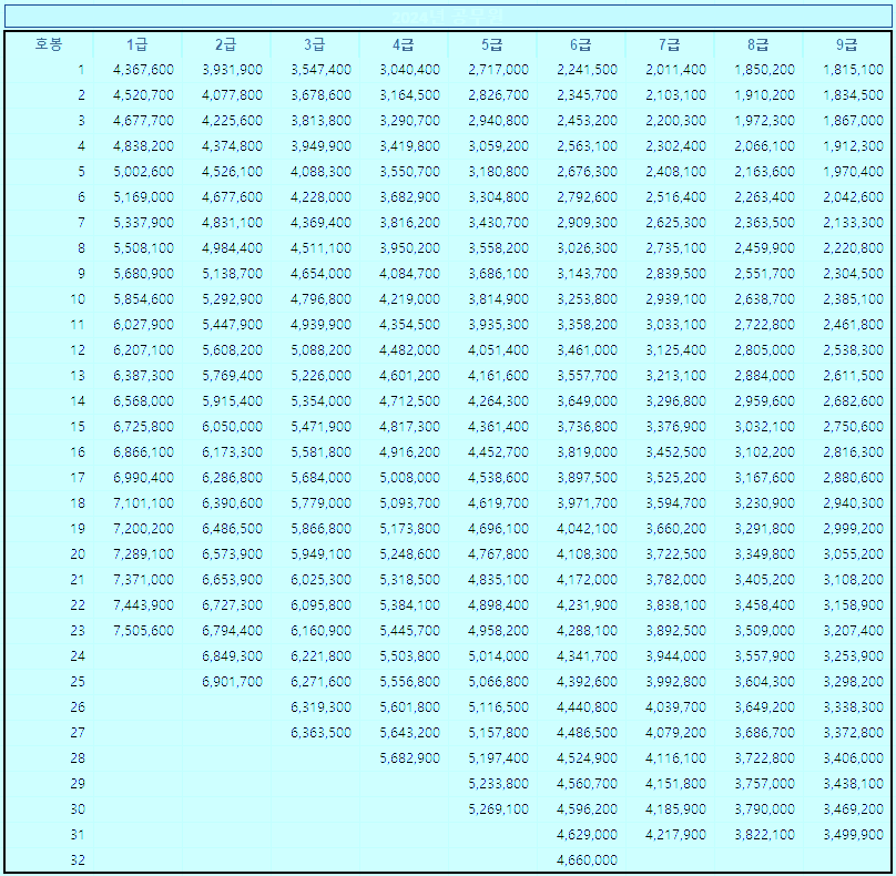 해당 표는 2023년 봉급표에 2.5%의 인상분을 반영하여 필자가 계산하여 작성한 표이니 참고만 해주시기 바랍니다.