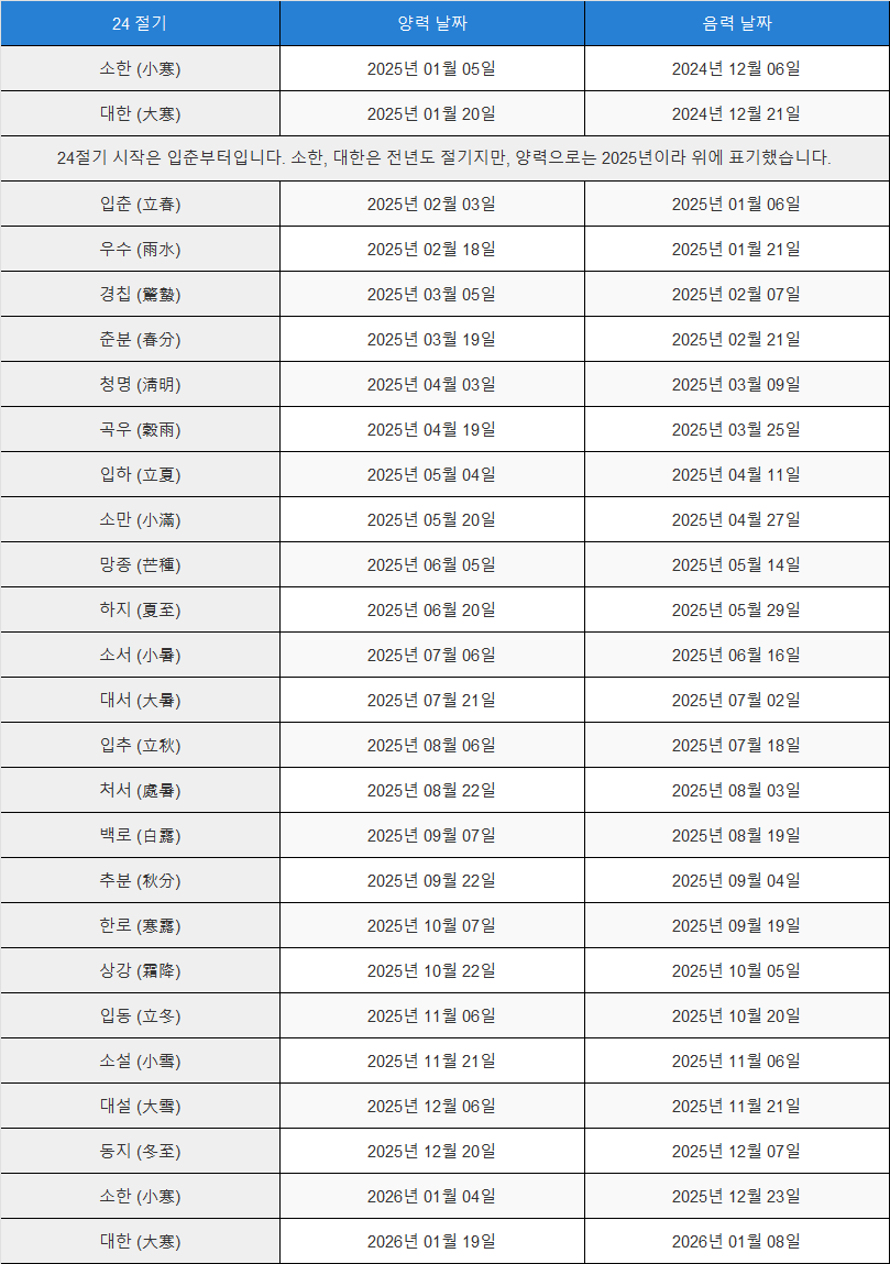 | 24절기 시작은 입춘부터입니다. 소한, 대한은 전년도 절기지만, 양력으로는 2025년이라 위에 표기했습니다. | ||